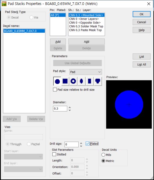 Setup에서 Pad Stacks를 선택하여 들어간 후 설정을 변경하여 주면 됩니다.