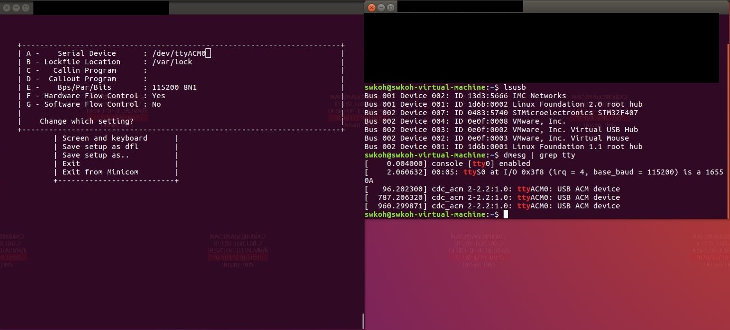 USB로 시리얼로 읽을 수 있는 방식은 기본적으로 USB CDC-ACM이고 리눅스에서 확인해보면 ttyACMx라고 나오게 됩니다. 보레이트까지 나올 줄은 몰랐는데... 리눅스 터미널 프로그램인 minicom을 깔고 minicom에서 dmesg를 통하여 확인한 ttyACMx를 Serial Device에 설정 후 확인을 하면 됩니다. 저는 echo로 프로그램을 짜서 확인하였습니다.